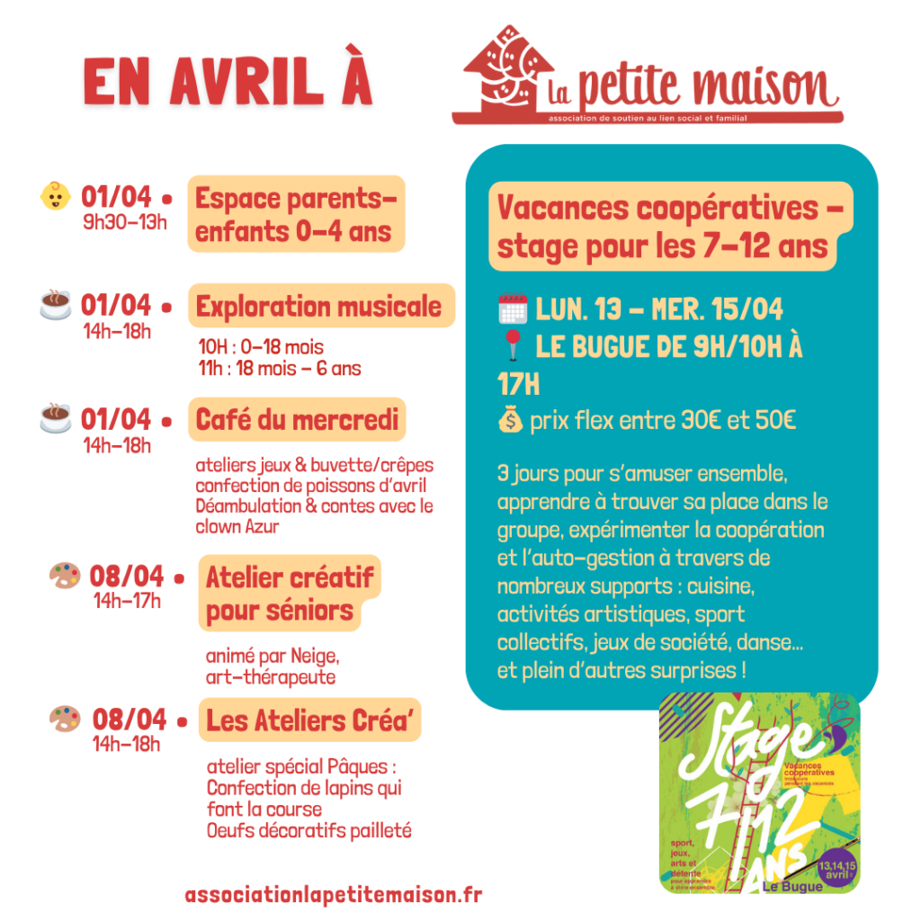 Tous nos accueils et activités se veulent ouverts, bienveillants et conviviaux. N’hésitez pas à venir pousser la porte de La Petite Maison, ponctuellement ou régulièrement, et à partager l’information autour de vous 💛 Au plaisir de vous retrouver très bientôt, 💛 L’équipe de La Petite Maison Espace de Vie Sociale