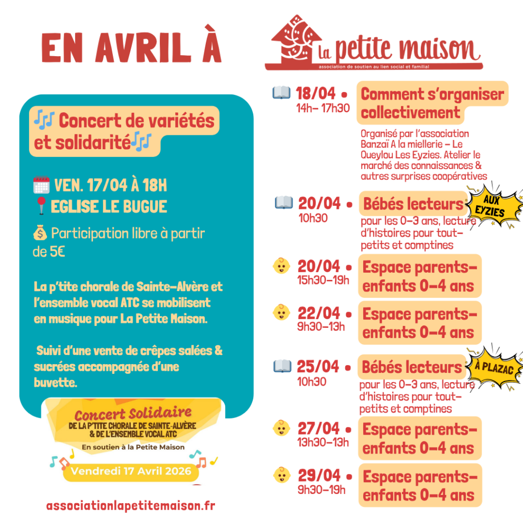 📚 Atelier – Comment s’organiser collectivement ? 📍 Les Eyzies 📅 Vendredi 18 avril | 14h – 17h30 Organisé avec l’association Banzai (La Miellerie – Le Queylou). Un atelier participatif autour des pratiques coopératives, avec marché des connaissances et surprises !